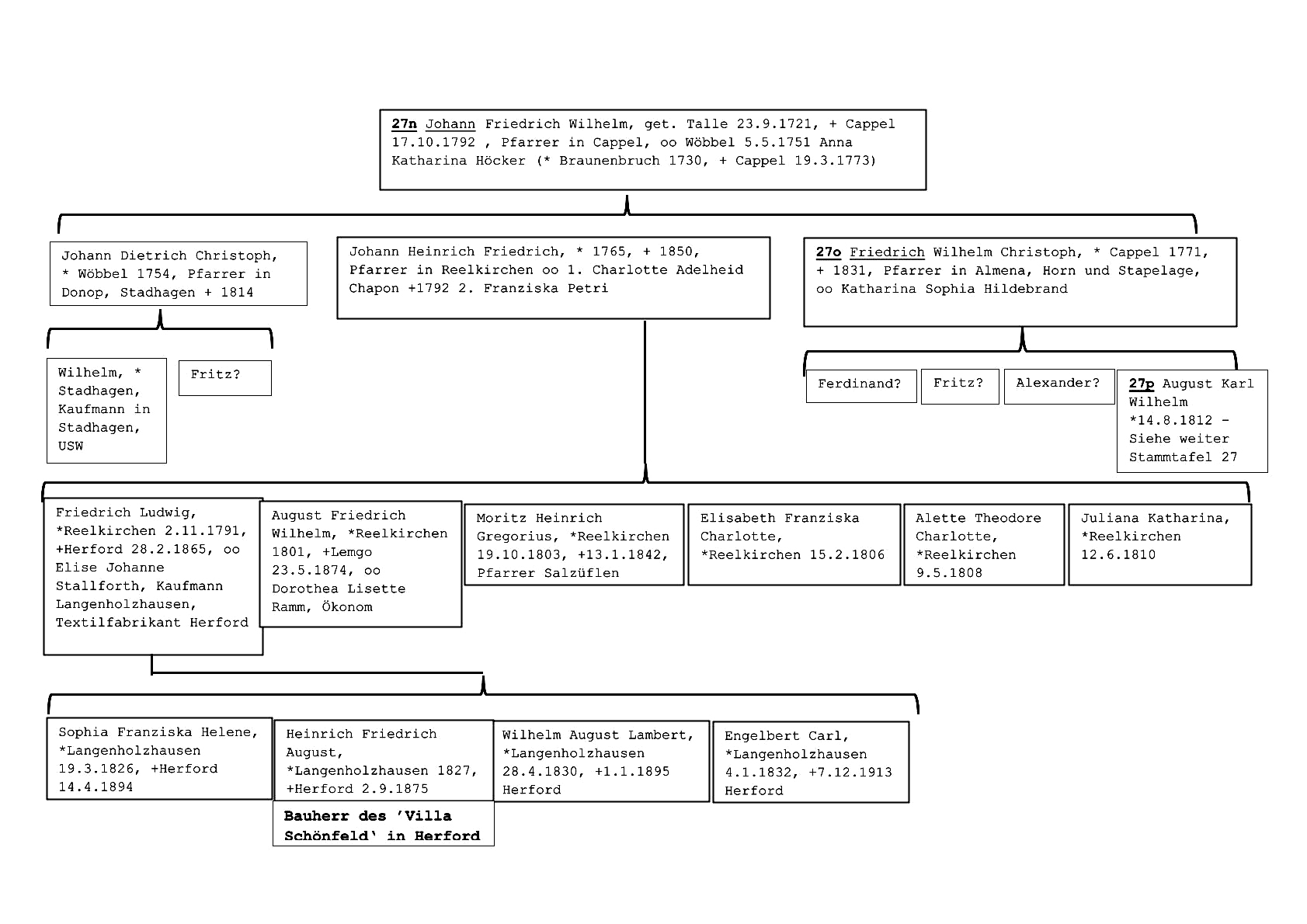 Hier ein erster Entwurf einer Stammtafel, die den Zusammenhang zwischen Johann Friedrich Wilhelm (Tafel 27 – Buchstabe n) und Heinrich Friedrich August zeigt: